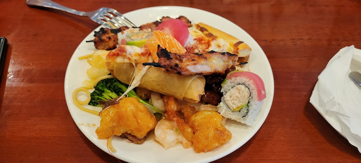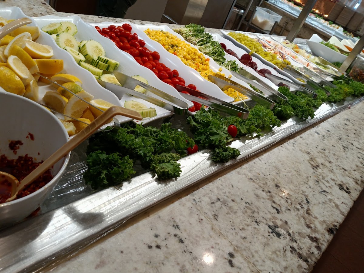 The menu includes a broad mix of Chinese and Japanese-inspired dishes, with highlights like the sushi and sashimi bar, a poke salad station, and a teppanyaki-style grill where chefs prepare noodles with veggies and meat right in front of you. There’s also a well-stocked salad bar and several soups to sample, catering to those who prefer lighter or more varied bites alongside heartier options.