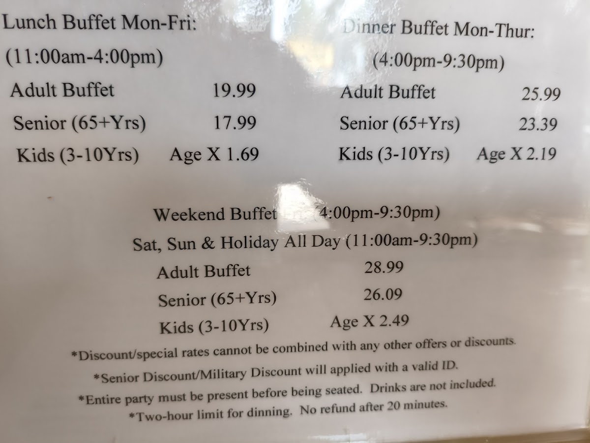 This menu is primarily suited for casual dining occasions where guests serve themselves from a variety of freshly prepared options. The buffet structure supports a broad selection of Asian-inspired dishes alongside classic buffet staples, allowing for flexible meal choices during lunch and dinner hours. The setup caters to diners seeking a diverse range of flavors in a single visit, with continuous replenishment of food items to maintain availability.